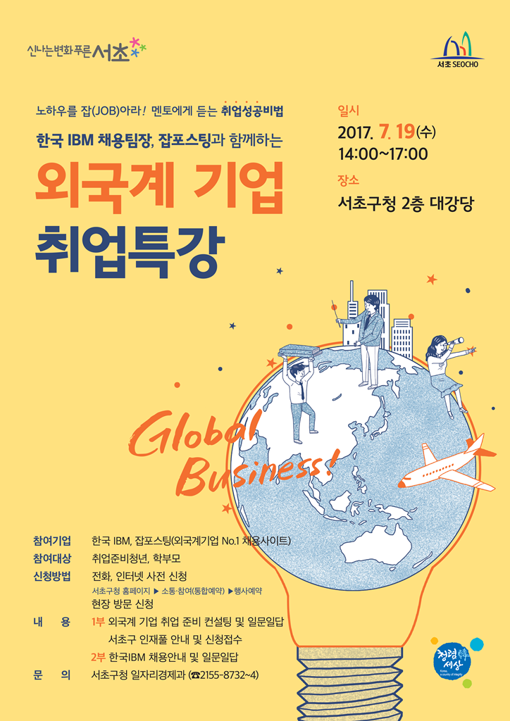 청년일자리 문제 해소 및 청년취업 지원을 위하여 한국IBM 채용팀장, 잡포스팅(외국계기업 채용 사이트) 전문 컨설턴트를 초빙하여 『2017. 하반기 외국계기업 취업특강』을 아래와 같이 개최하고자 하니, 관련 분야 취업에 관심 있는 학생들은 취업특강에 적극 참여하여 주시기 바랍니다.