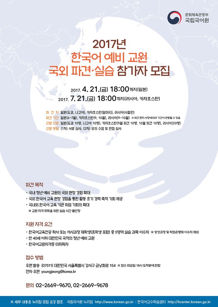 | 제목 | 한국어 예비교원 국외 파견·실습 참가자 모집 | 날짜 | 2017-07-13 | 조회수 | 275 | ||||||||||||