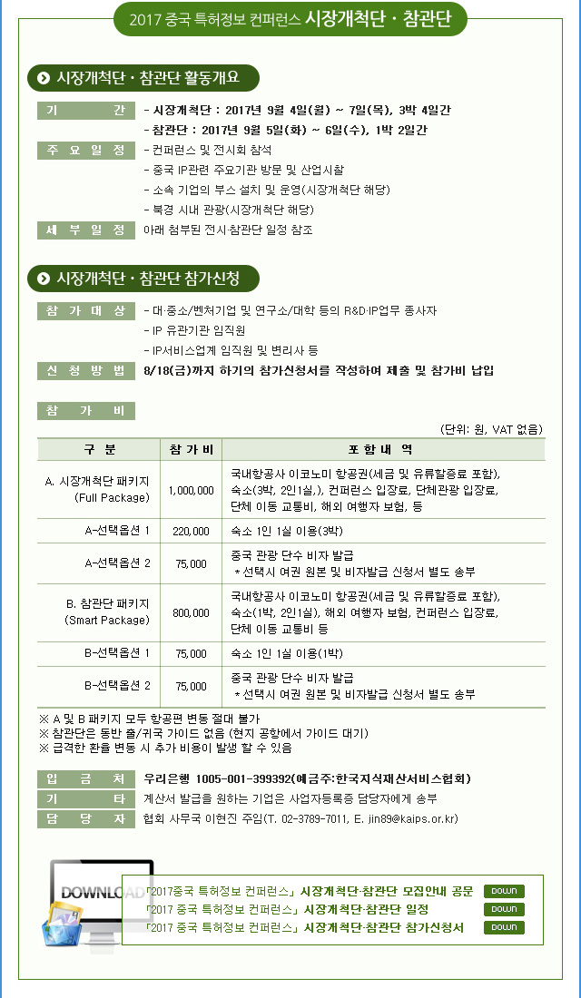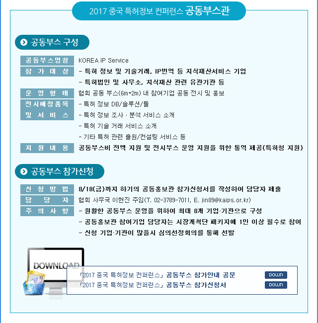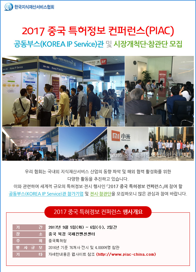 2017 중국 특허정보 컨퍼런스(PIAC) 공동홍보관 참가기업 및 시장개척단·참관단 모집