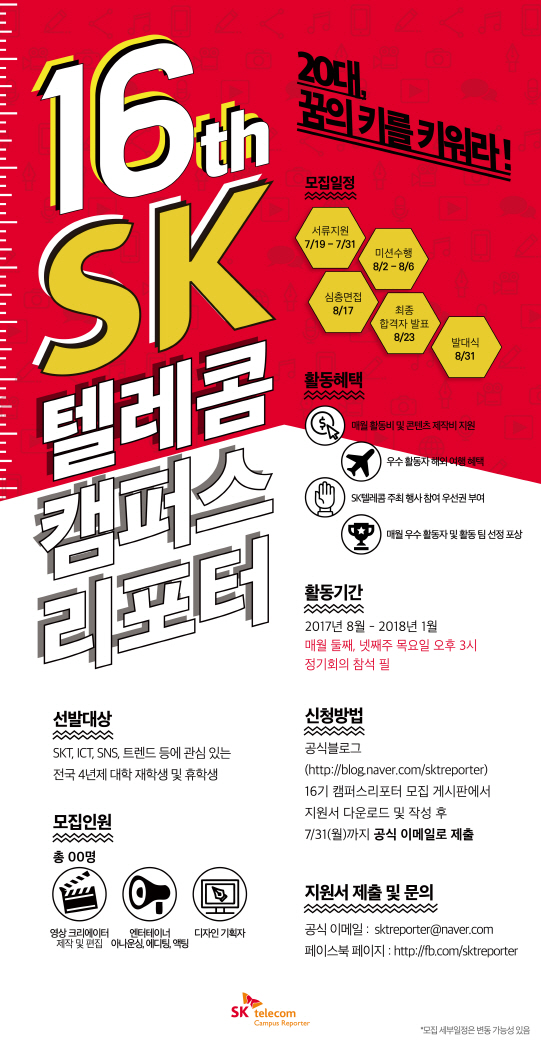 프로그램명: SK텔레콤 캠퍼스리포터 신청기간: 2017년 7월 19일(수) ~ 7월 31일(월) 참가대상: 국내 거주중인 내국인 재(휴)학생(외국인 유학생 가능) 모집분야: 영상 크리에이터/디자인 기획자/엔터테이너 (총 3개 분야) 혜택: SK텔레콤 기업 행사 취재 및 상품/서비스 체험 우선권 부여 SK텔레콤 실무 담당자 인터뷰 및 강연 기회 제공 우수 활동자 대상 해외 탐방 취재 기회 제공 매월 활동비 지급 및 콘텐츠 제작비 지원 매월 우수 활동자 및 활동 팀 선정 포상 신청방법: 공식 블로그(blog.naver.com/sktreporter) 내16기 모집 요강 참고 문의: SK텔레콤 캠퍼스리포터 운영 사무국(02-2257-6370)