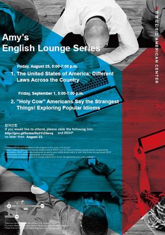 안녕하십니까? 주한미국대사관에서 아메리칸센터 시리즈 프로그램-잉글리쉬 라운지 (Amy’s English Lounge Series) 행사에 초대합니다. “잉글리쉬 라운지”는 주한미국대사관 아메리칸센터 시리즈 프로그램 중 하나로, 잉글리쉬 라운지 시리즈 는 한 달에 두번, 2번째 및 4번째 금요일에 진행되며 미국인 강사가 진행을 맡아 현재 미국에서 일어나는 주요 현안에 관한 논의의 장을 마련하여 수업을 진행할 예정입니다.