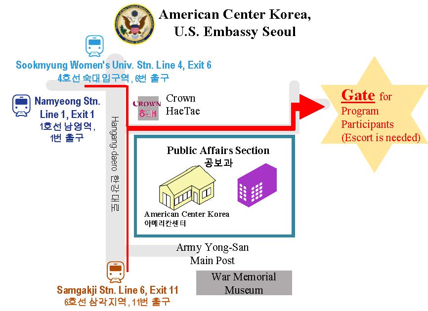 출입관련 안내 : * 아메리칸센터 공사로 인해 행사 당일 참가자는 오후 4시 40분까지 첨부 약도 참조하여 (빨간색으로 출입구 표기) 용산구 남영동 소재 주한미국대사관 공보과로 도착 부탁합니다. 행사 당일 에스코트가 필요하므로 시간 엄수하여 도착 부탁드리겠습니다.