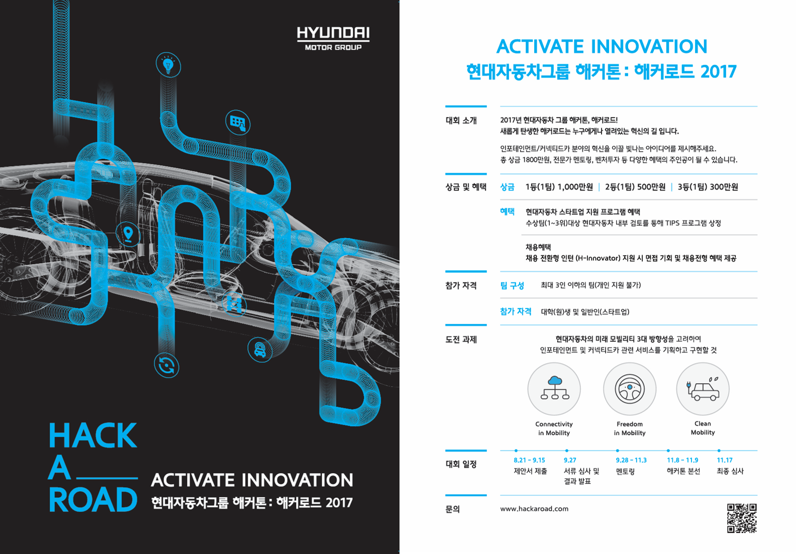 현대자동차그룹 해커톤 : 해커로드 2017 행사 개요 1) 행사 내용 : 현대자동차가 주최하는 미래 모빌리티 아이디어 경진대회 2) 참가 자격 : 만 19세 이상의 성인, 팀 구성(개인 또는 최대 3인 이하의 팀) 3) 모집 기간 : 2017년 8월 21일(월) ~ 9월 15일(금) 4) 주요 일정 - 제안서 제출 : 8월 21일(월) ~ 9월 15일(금) - 서류 심사 및 결과 발표 : 9월 27일(수), 총 40팀 선정 - 멘토링 : 9월 28일(목) ~ 11월 3일(금) - 해커톤 본선 : 11월 8일(수) ~ 9일(목)